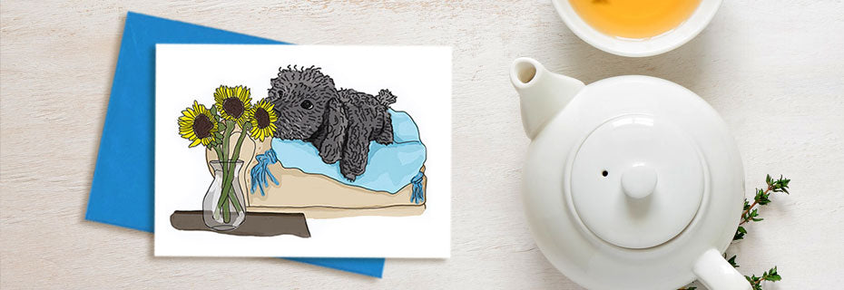 Dog & Sunflowers – Toy Poodle Sniffing Flowers DESIGN: His name is Peanut and he loves sniffing flowers! This doggy moment is perfect for birthdays, Mother’s Day or just because. A hand painted water color illustration, captured and printed digitally....