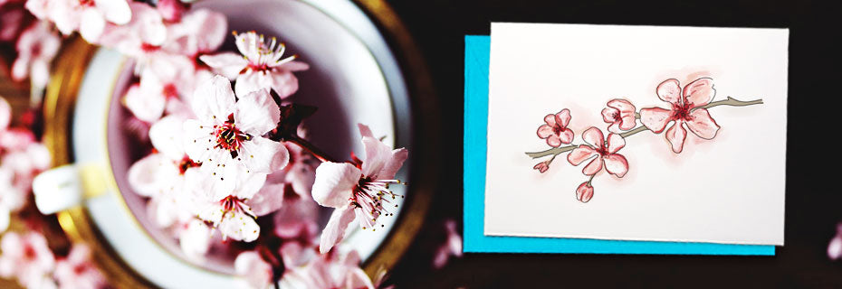 Cherry Blossom Card DESIGN: Friendly cherry blossoms are a welcome sign of spring time. Send this card for Mother’s Day or to simply spread some spring cheer! A hand painted water color illustration, captured and printed digitally. SENTIMENT: Blank (We...